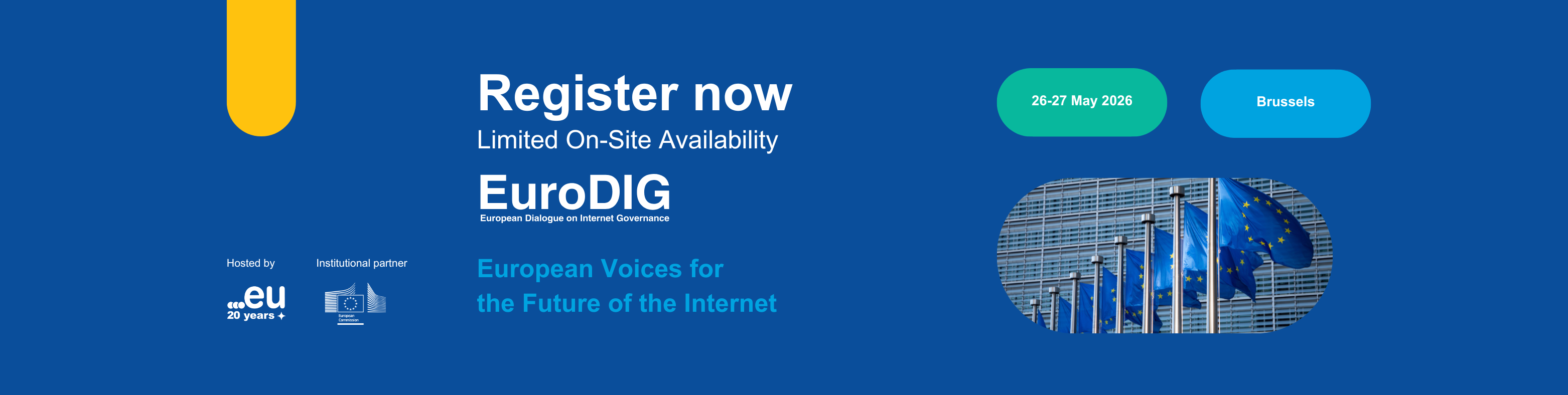 The next EuroDIG will take place on 26–27 May 2026 at the Charlemagne Building of the European Commission in Brussels. Hosted by EURid and supported by the European Commission, a longstanding institutional partner of EuroDIG, the event will also mark 20 years of .eu. Therefore, the overarching theme for EuroDIG 2026 is “European Voices for the Future of the Internet – Celebrating 20 Years of .eu and the Beginning of a New IG Decade.”